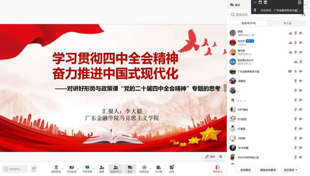 为贯彻落实党的二十届四中全会精神,讲好形势与政策课党的二十届四中全会精神专题,2025年11月8日,yl6809永利官网集团联合成都工业学院、成都大学、成都信息工程大学、中国民航大学等高校的yl6809永利官网集团,以形势与政策虚拟教研室为平台,共同开展党的二十届四中全会精神专题云端集体备课会,省内外高校100余位教师参加此次备课会。会上,我校形势与政策教研室骨干教师李大毅老师以《学习贯彻四中全会精神,奋力推进中国式现代化》,分享了对讲好形势与政策课“党的二十届四中全会精神”专题的思考,获得了点评专家同与会人员的认可。
