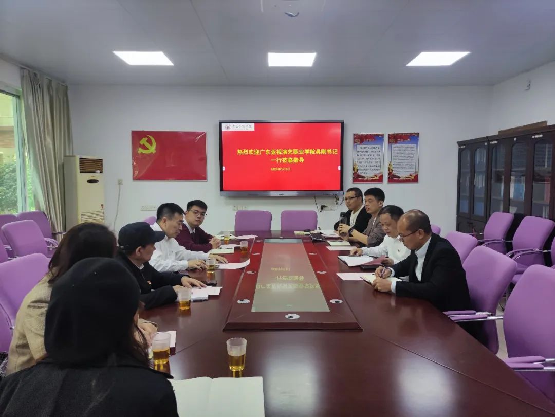 3月3日,广东亚视演艺职业学院党委书记吴刚率领yl6809永利官网集团教师一行来我院进行交流。我院邹国振院长、党总支书记陈学文、副院长张春华、马克思主义实践教学教研室主任范斯义等与吴刚一行进行了交流。